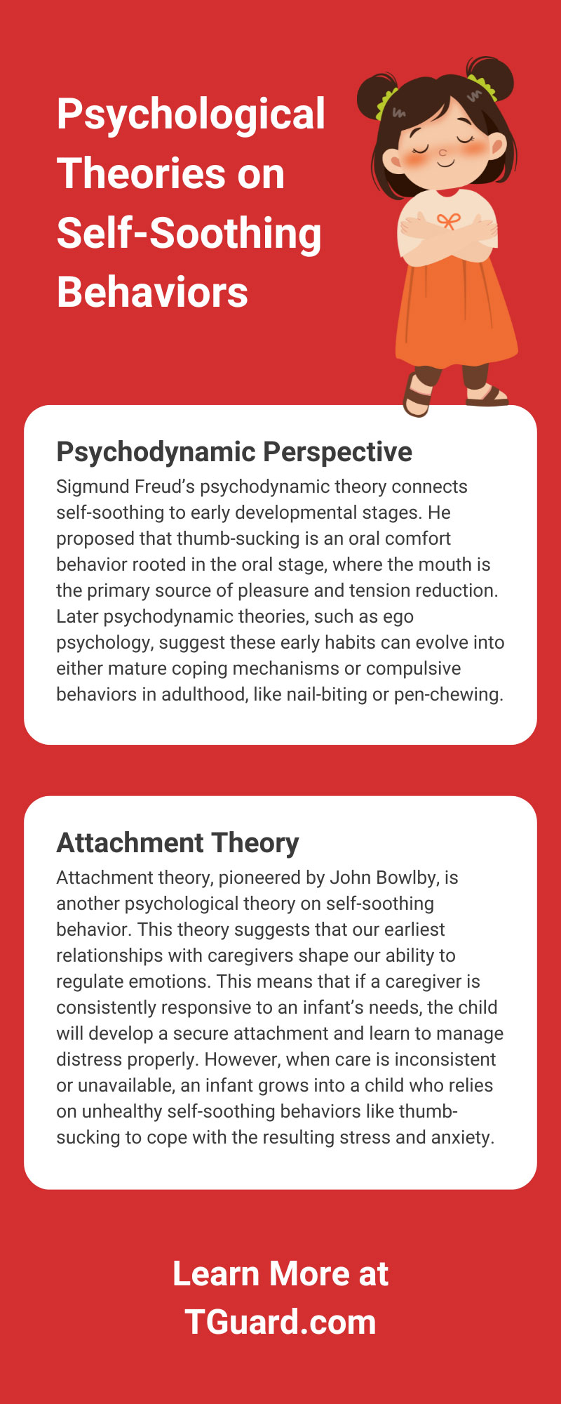 Sigmund Freud’s psychodynamic theory connects self-soothing to early developmental stages. He proposed that thumb-sucking is an oral comfort behavior rooted in the oral stage, where the mouth is the primary source of pleasure and tension reduction. Later psychodynamic theories, such as ego psychology, suggest these early habits can evolve into either mature coping mechanisms or compulsive behaviors in adulthood, like nail-biting or pen-chewing.